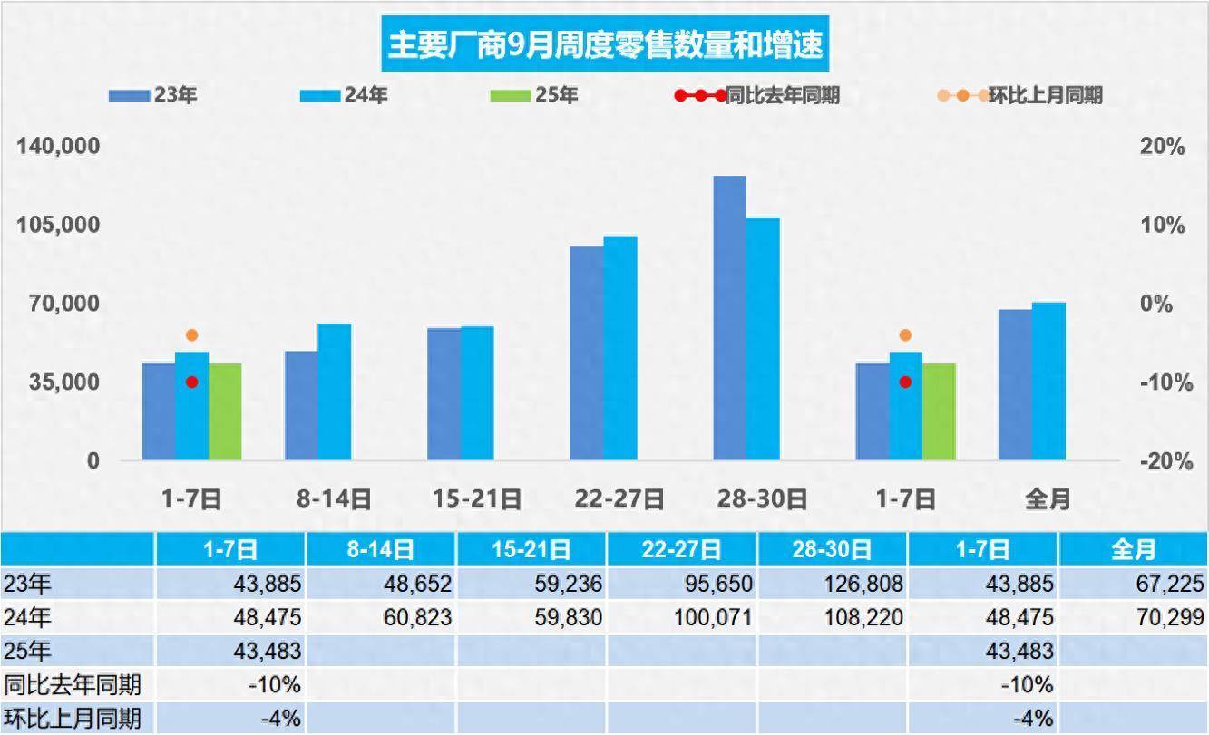 2025年9月车市零售开局走势平稳,相对于2023年基本持平,但弱于2024年9月初的表现。由于2024年7月底开始的国家以旧换新政策加力扩围,带动8月零售走强超预期,但厂商的8月目标并不高,因此部分经销商的去年8月末销量转到9月初,实现月度销量进度的更均衡,这也导致今年的9月初车市出现一定的负增长,尤其是部分地区的以旧换新政策实施更考虑补贴的可持续性,部分地区的销量走势偏慢。